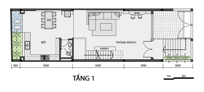 Tầng trệt: Phòng khách, bếp + phòng ăn, WC