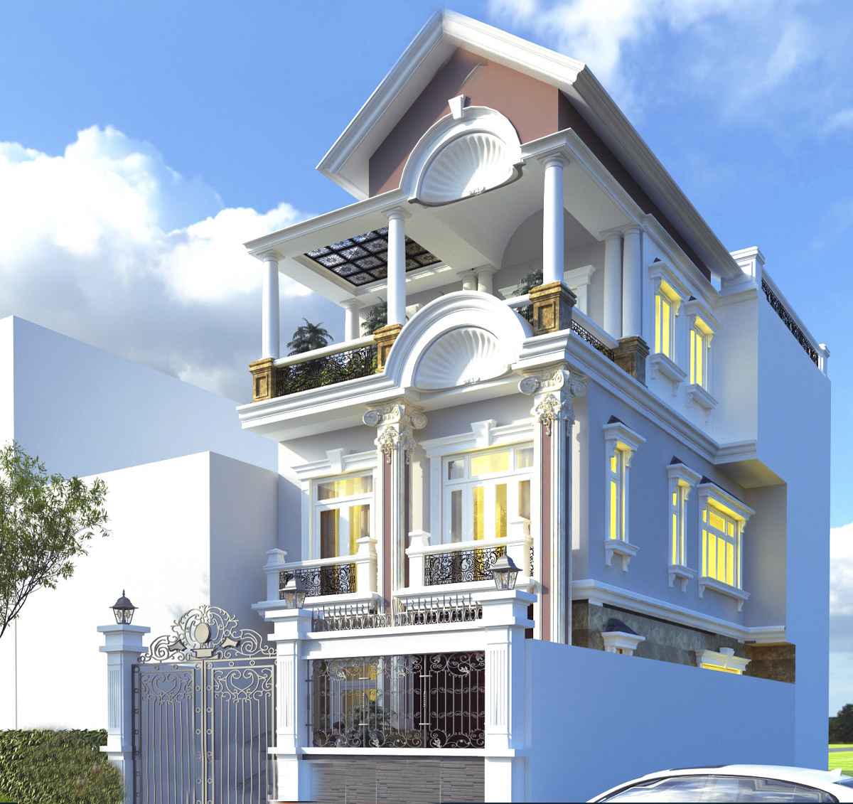 Bên cạnh các thiết kế hiện đại khi nhìn căn biệt thự ở hướng chính diện, chúng ta có thể nhìn thấy được những chi tiết rất "cổ điển" thông qua chi tiết mái ngói ngói nhấp nhô trên các cửa sổ ở hai bên của ngôi nhà. Đúng theo lối thiết kế hiện đại hòa vào thiên nhiên, các ban công hai bên và phí trước ngôi biệt thự sẽ là nơi những thành viên trong gia đình co thể hít thở không khí tươi mát của khí trời vào những buổi sáng sớm hoặc khi đêm về.