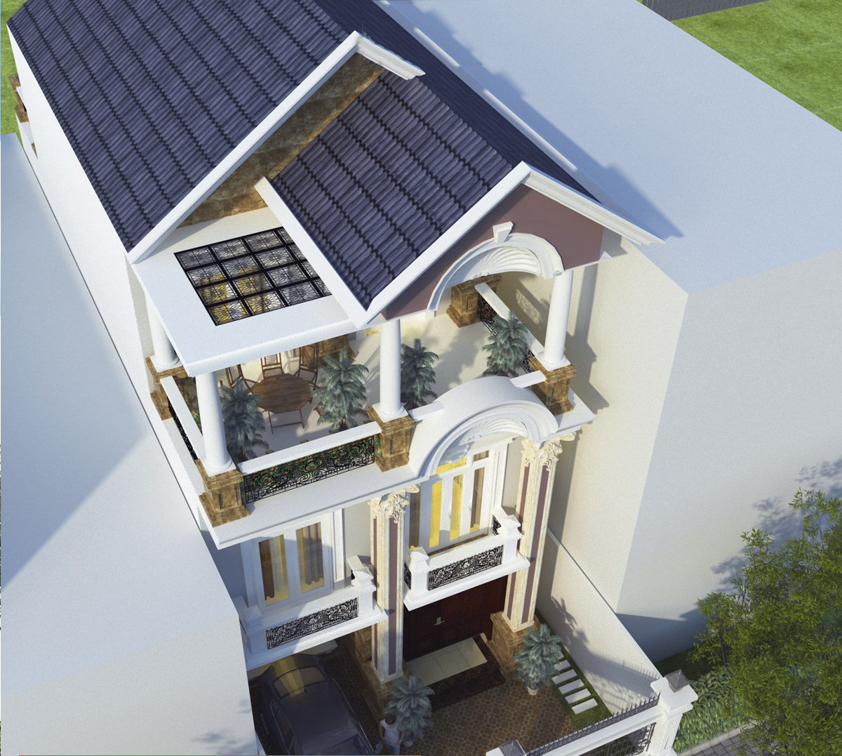 Bên cạnh các thiết kế hiện đại khi nhìn căn biệt thự ở hướng chính diện, chúng ta có thể nhìn thấy được những chi tiết rất "cổ điển" thông qua chi tiết mái ngói ngói nhấp nhô trên các cửa sổ ở hai bên của ngôi nhà. Đúng theo lối thiết kế hiện đại hòa vào thiên nhiên, các ban công hai bên và phí trước ngôi biệt thự sẽ là nơi những thành viên trong gia đình co thể hít thở không khí tươi mát của khí trời vào những buổi sáng sớm hoặc khi đêm về.